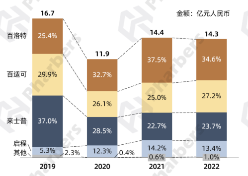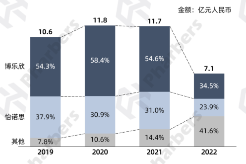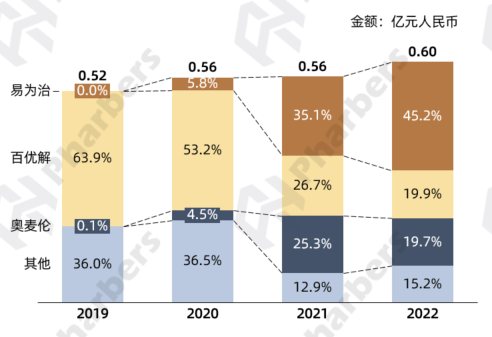 数据显示,礼来百优解的市场份额从2019年的63.9%缩减到2022年的19.9%,而山西仟源医药的易为治在VBP中标后市场规模迅速扩大,2021-2022年蝉联该品类市场份额第一名。