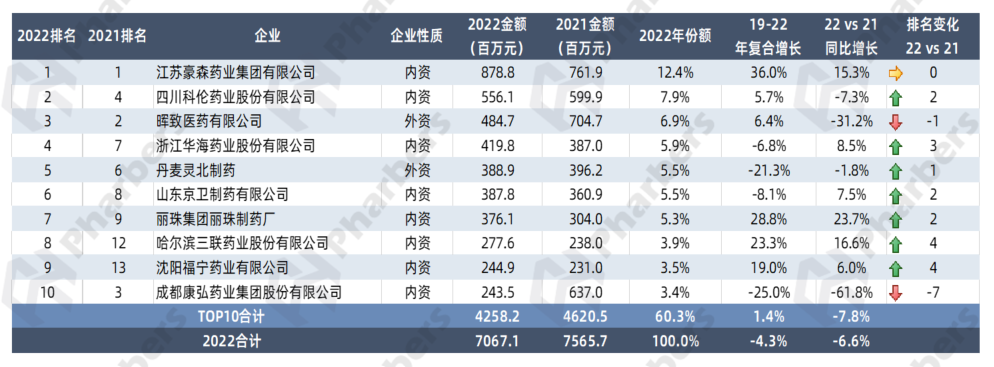表2-2022年全国医院抗抑郁药物市场销售额TOP10厂家