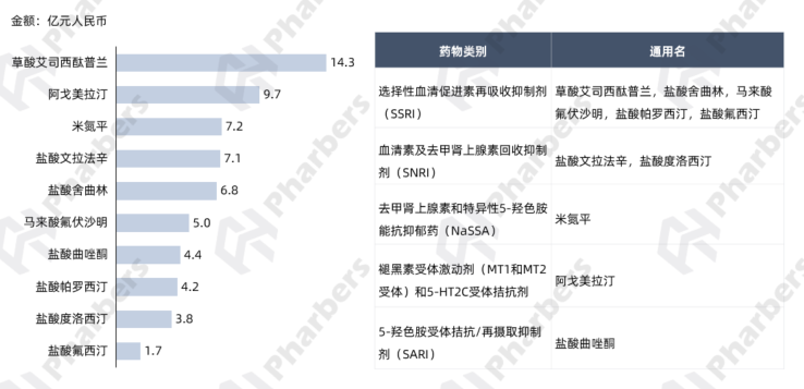图1-2022年全国医院抗抑郁药销售额TOP10分子及类别