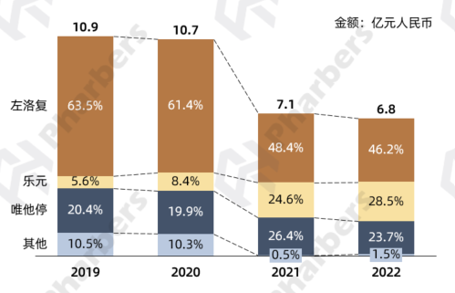 数据显示,2019-2022年怡诺思在院内的市场份额持续下降,2021年第五批VBP后,随着4个国内企业中标,文拉法辛品类市场被更多“后来者”抢占。