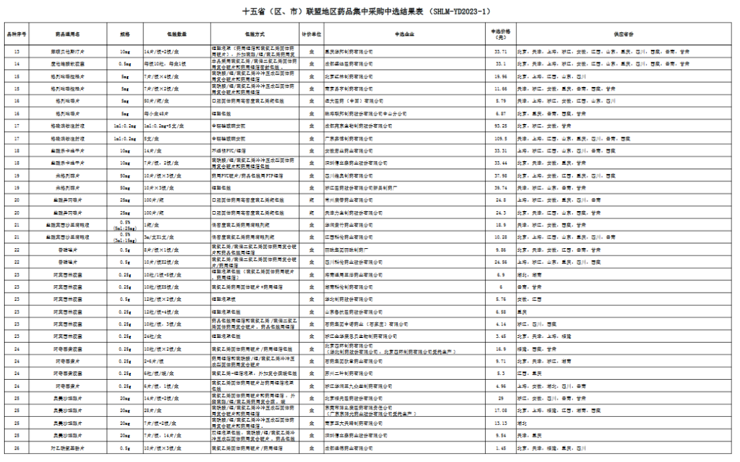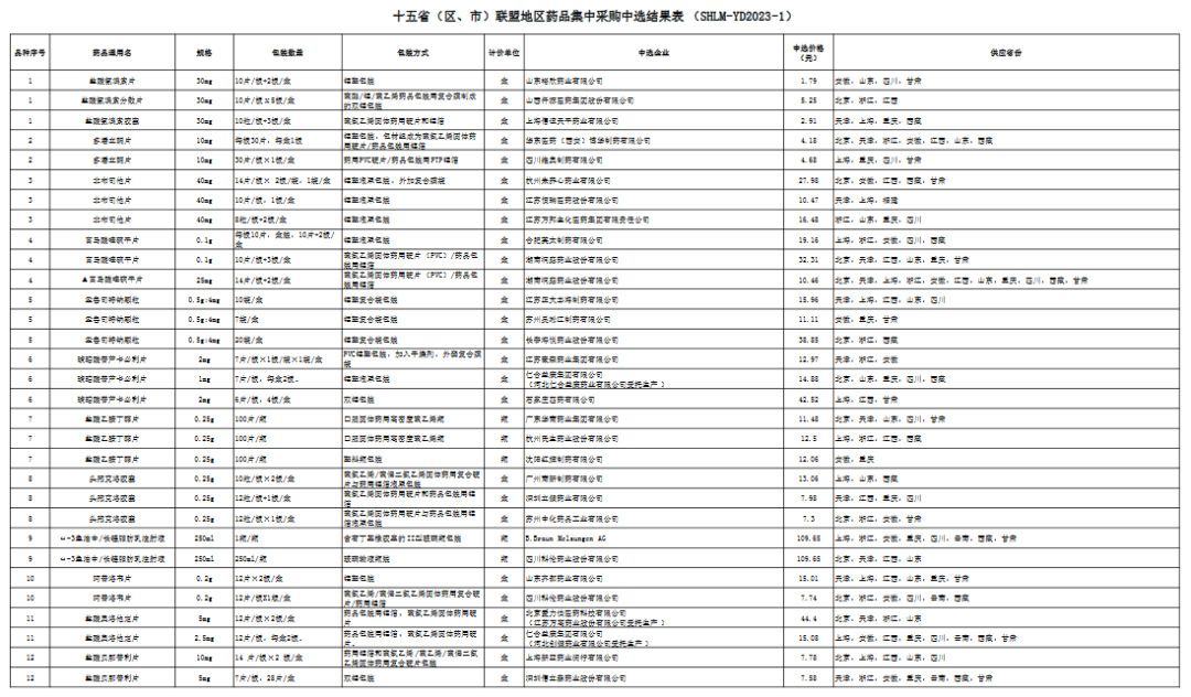 11月20日,上海阳光医药采购网发布《关于公布十五省(区、市)联盟地区药品集中采购(SHLM-YD2023-1)中选结果的通知》。 49个药品中选结果公布,包括盐酸氨溴索片、盐酸氨溴索分散片、盐酸氨溴索胶囊、多潘立酮片等,这些药品均是国家集采即将到期的品种,多为慢病常见病用药。同时,十五省(区、市)联盟的备供情况和供应清单也已公布。至于具体的执行日期,暂未公布。 十五省(区、市)联盟地区药品集中带量采购由北京、天津、上海、浙江、安徽、福建、江西、山东、湖北、湖南、重庆、四川、云南、西藏、甘肃组成,成立国家集采药品接续上海联盟采购办公室开展带量采购。从拟中选规则看,主要分为入围、拟中选药品确定两个步骤。入围主要看价格,入围后才有资格确定拟中选药品。本次带量采购的采购周期从中选结果执行之日起至2025年12月31日。 业内有专家认为,国家集采接续上海联盟采购办成立,可以统筹管理国采接续工作,避免当前接续乱、密等可能存在的问题。附:十五省联盟药品集采中选结果