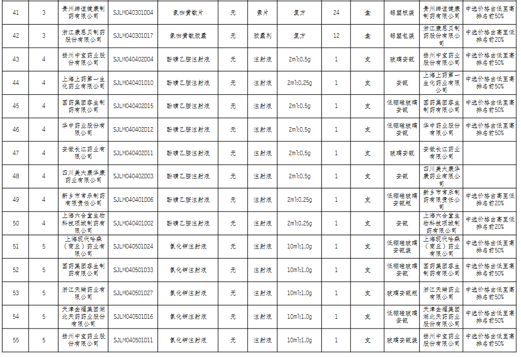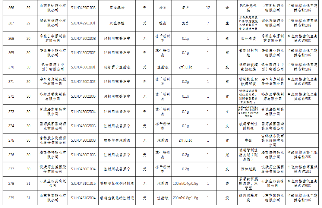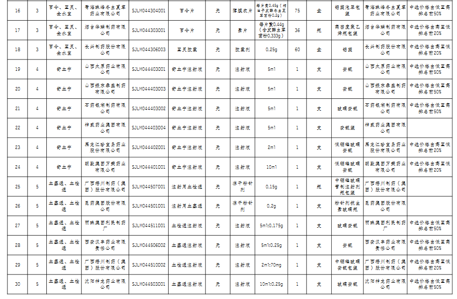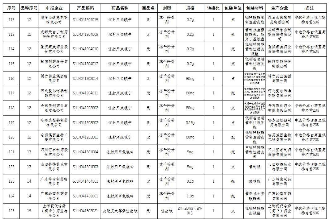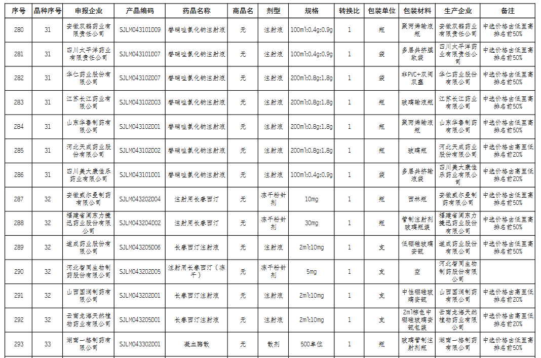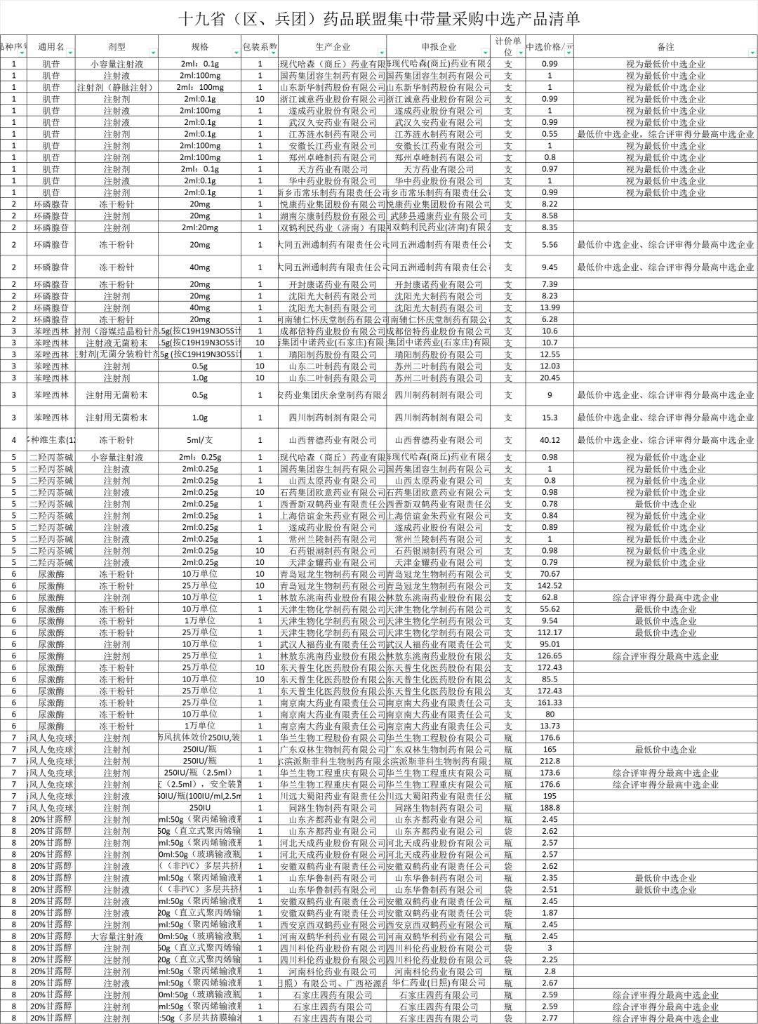 十九省(区、兵团)药品联盟集中带量采购中选产品清单