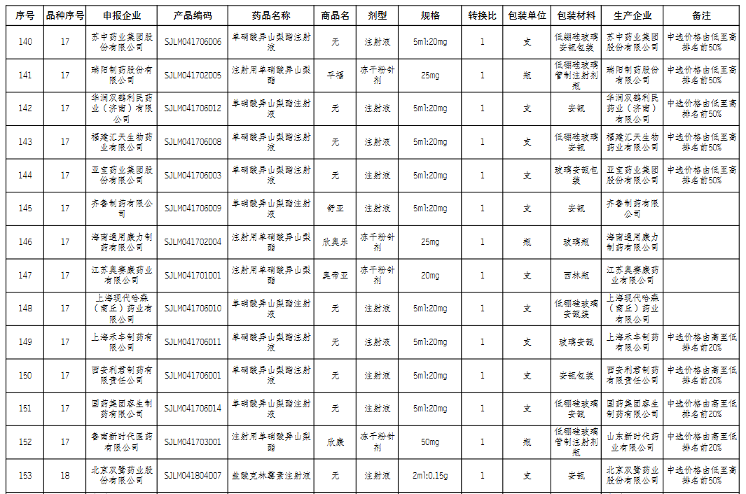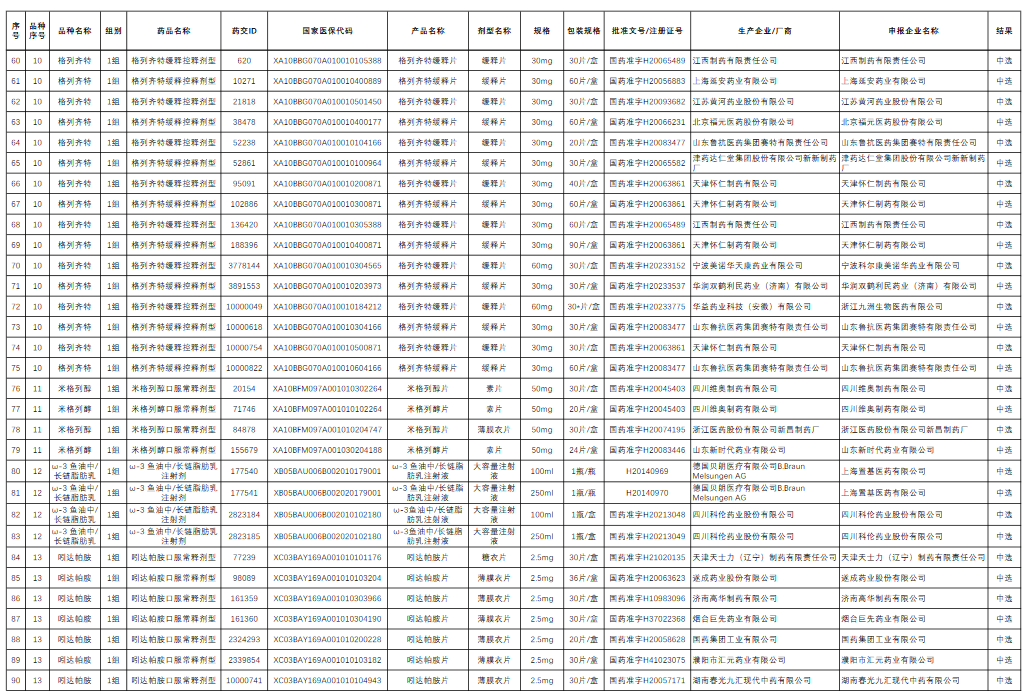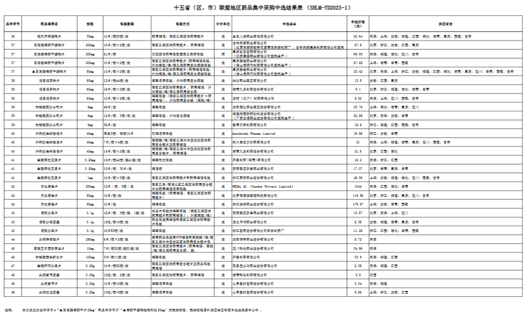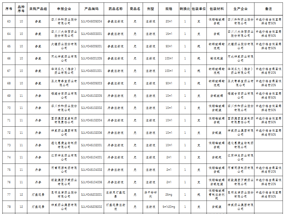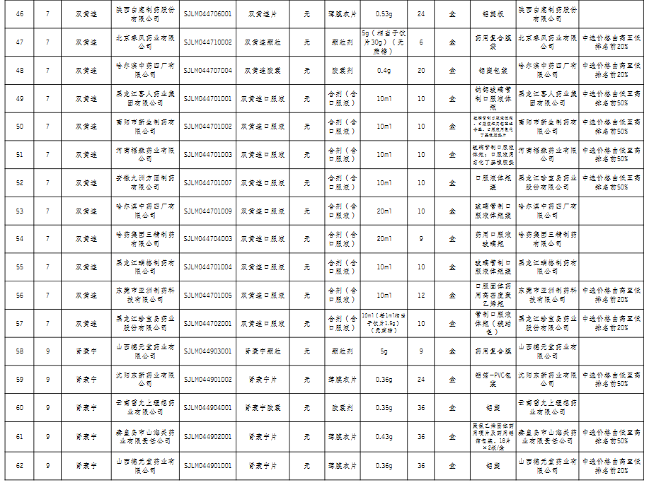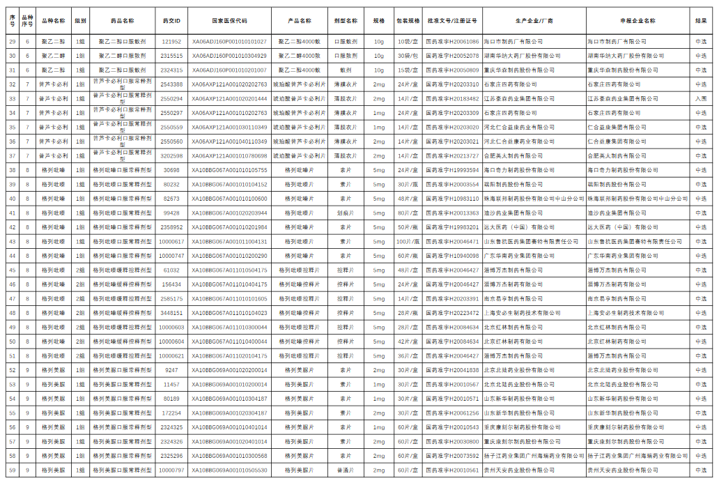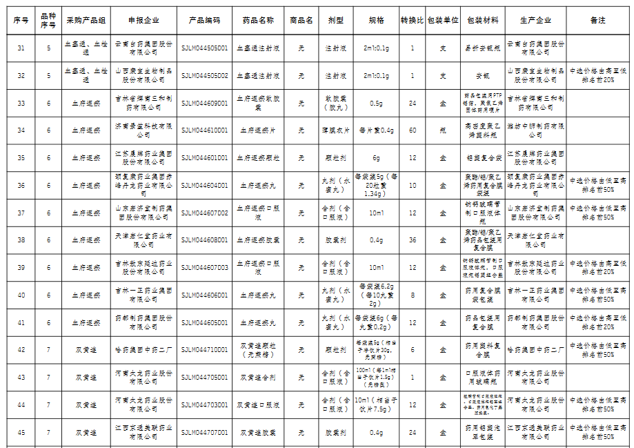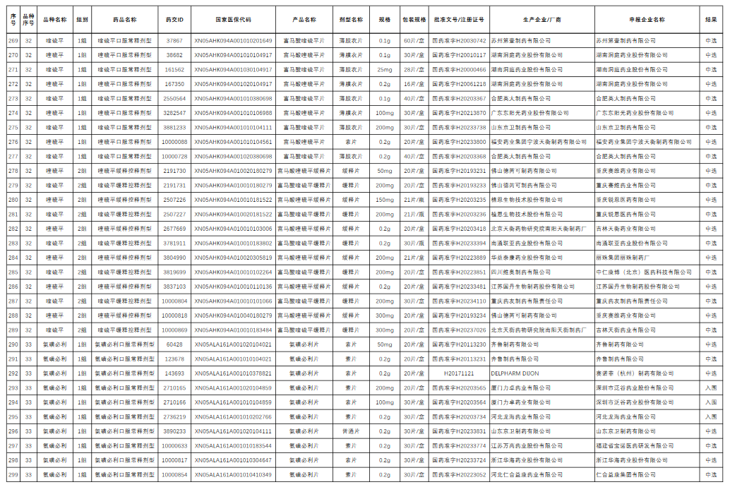 十九省(区、兵团)药品联盟集中带量采购中选产品清单