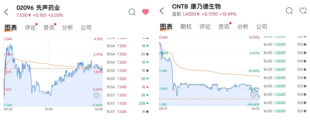 康乃德11月21日当晚实现了巨额跌幅,截至收盘下跌38.83%;反观先声医药,则是在11月22日港股医药板块表现普遍较差的情况下,实现了2.03%的小幅上涨。