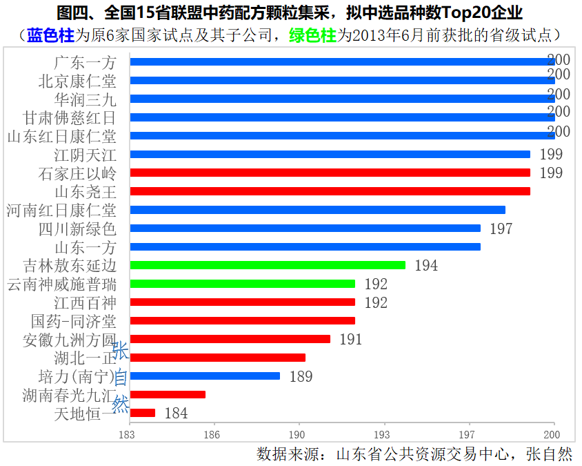 紧追其后的是2013年6月国家中医药局发文叫停前获批的两家省级试点企业神威药业集团旗下的云南神威施普瑞、吉林力源(现已被重组为吉林敖东延边制药)的拟中选品种数也较多,分别拟中选了192个、194个品种(图四中的绿色柱)。