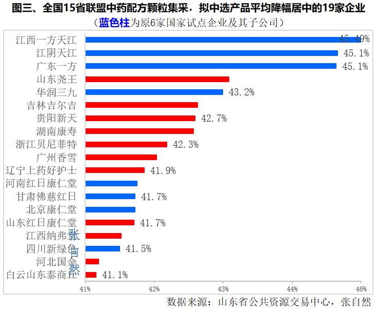 除培力(南宁)降幅40%外,其余5家原国家试点(江阴天江、广东一方、华润三九、北京康仁堂、四川新绿色)的降幅都在41%~45%之间。(详见图三)