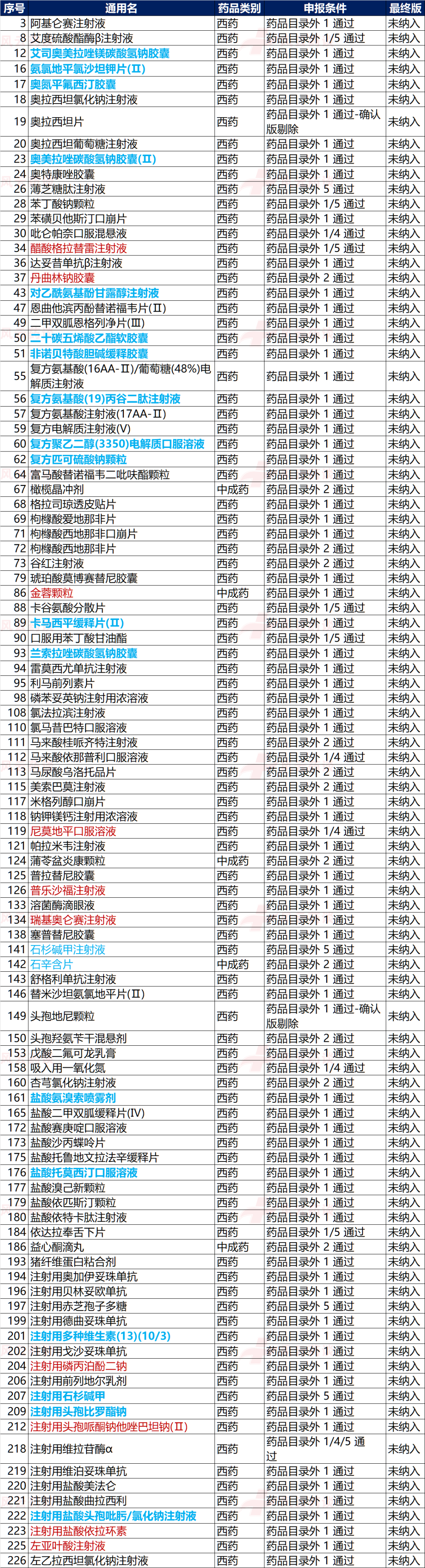 本次纳入创造了历史,但是未纳入的产品数量也不少,初步整理应该是有100个左右产品,如下表: