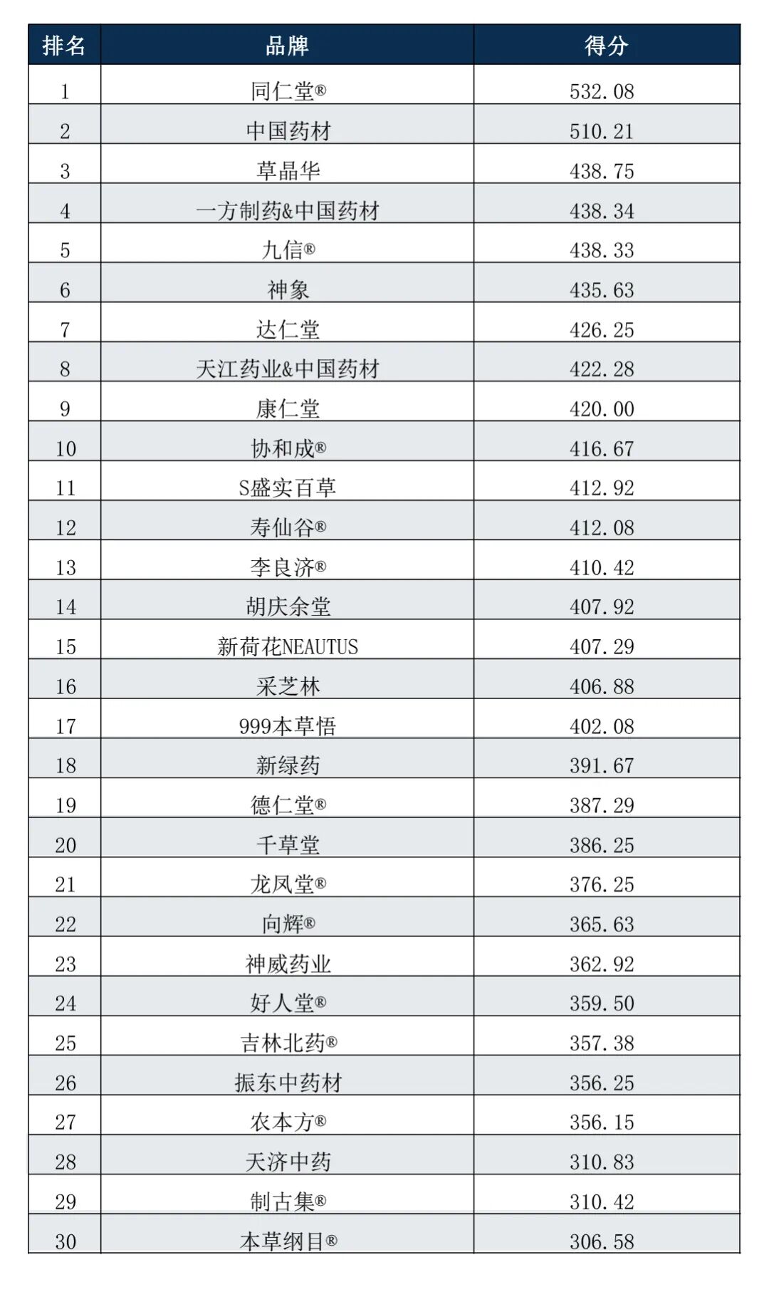 从评选结果来看,2023中药饮片品牌发展指数TOP30上榜品牌发展指数最高的同仁堂得分532.08分,上榜品牌入围门槛得分306.58分。中华老字号品牌和中药饮片配方颗粒试点企业旗下品牌具有明显的相对优势。同仁堂、达仁堂、寿仙谷、胡庆余堂、采芝林和德仁堂等6个商务部认定的中华老字号企业品牌入选TOP30榜单。一方、天江、康仁堂、999本草悟、新绿药和农本方6家配方颗粒试点企业全部上榜。另外,以草晶华、九信为代表的中药饮片新势力品牌表现优异,得分也名列前茅。