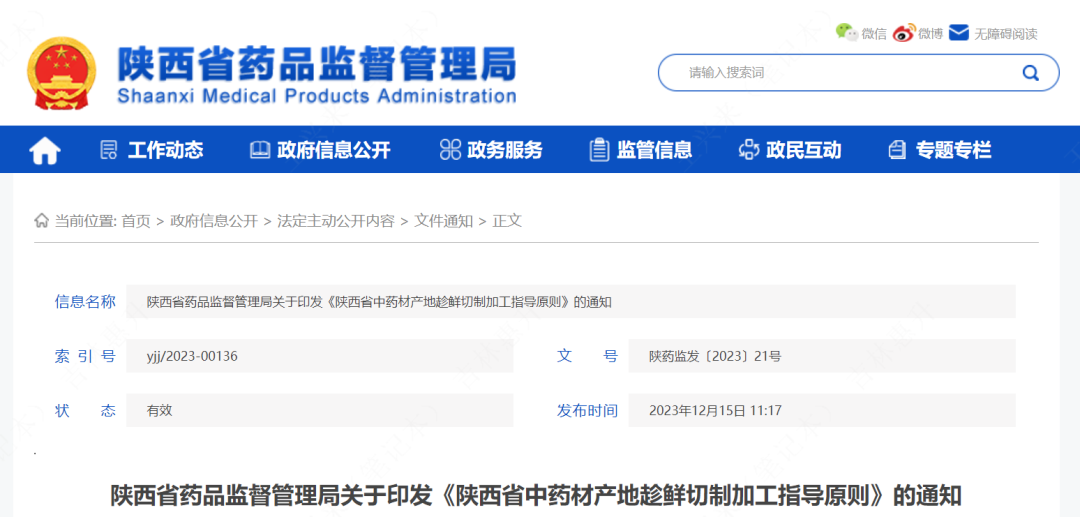 2023年12月15日,为解决中药材加工过程中因“二次浸润”后切制,造成有效成分流失和加工损耗增大难题,加强中药材质量“源头”管理,陕西药监局《陕西省中药材产地趁鲜切制加工指导原则》,自发布之日起实施。