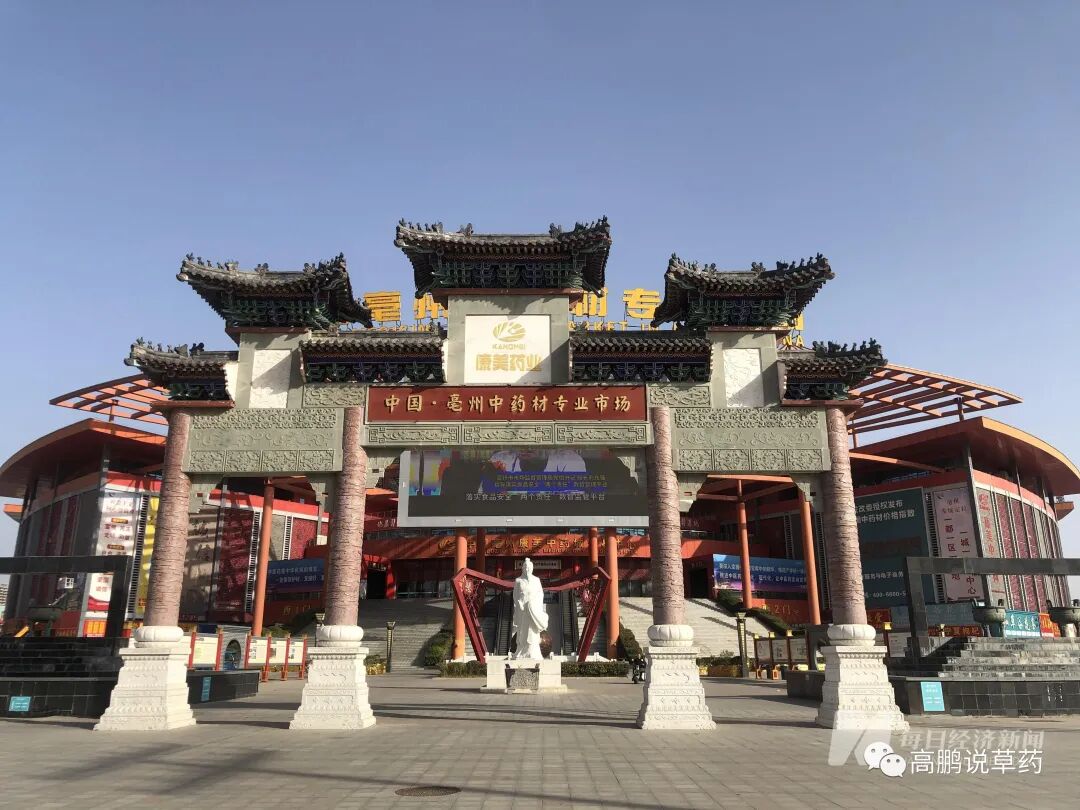 亳州中药材专业市场(也称“康美中药城”)是全国最大的中药材集散中心之一,其主体为红色建筑,颜色鲜艳,造型显眼。建筑外围大量的门面,也大多从事中药材相关的买卖。与其一路之隔的是物流中心和电商中心,这里交通完善、物流畅捷,客商迎来送往,络绎不绝。