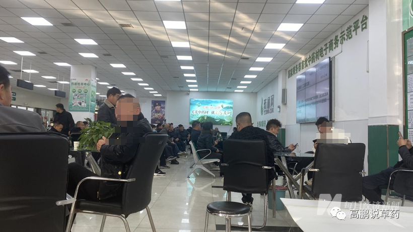在交易市场西大门靠右的位置,每经记者寻找到在当地影响力较大的药通网信息中心。推开玻璃门后,一楼交易大厅中央,一排工作人员正在办理业务,在他们身后,坐了约4至5排穿深色衣服的中年人,两边摆放的大圆桌周围,也聚满了人。