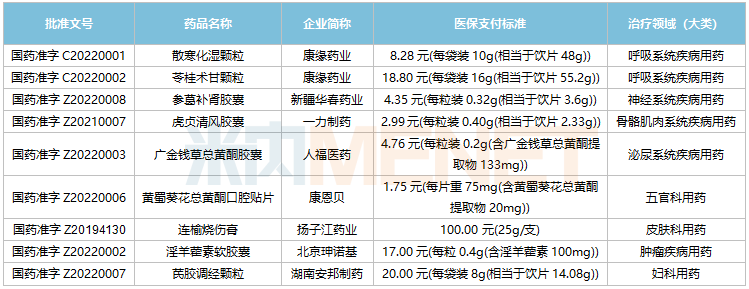 9个新增中成药里内服中成药有7个,包括康缘药业的散寒化湿颗粒和苓桂术甘颗粒、新疆华春药业的参葛补肾胶囊、一力制药的虎贞清风胶囊、人福医药的广金钱草总黄酮胶囊、北京珅诺基的淫羊藿素软胶囊、湖南安邦制药的芪胶调经颗粒等。
