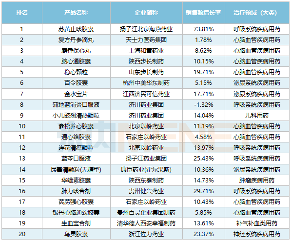 20个品种中,12个品种上半年销售额均超过10亿元,最低上榜门槛为6亿元。19个品种上半年销售额实现正增长,14个品种涨逾10%。其中,扬子江药业的苏黄止咳胶囊暴涨73.81%、蓝芩口服液大涨25.43%,贵州健兴药业的肺力咳合剂大涨29.71%,浙江佐力药业的乌灵胶囊大涨23.37%。