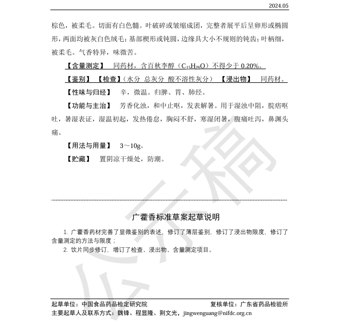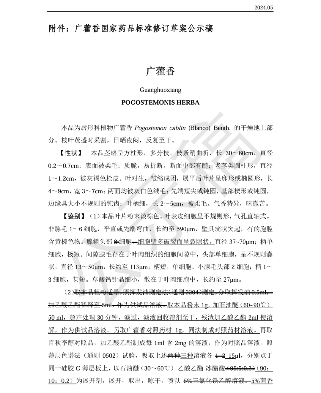 1.广藿香药材完善了显微鉴别的表述,修订了薄层鉴别,修订了浸出物限度,修订了含量测定的方法与限度;