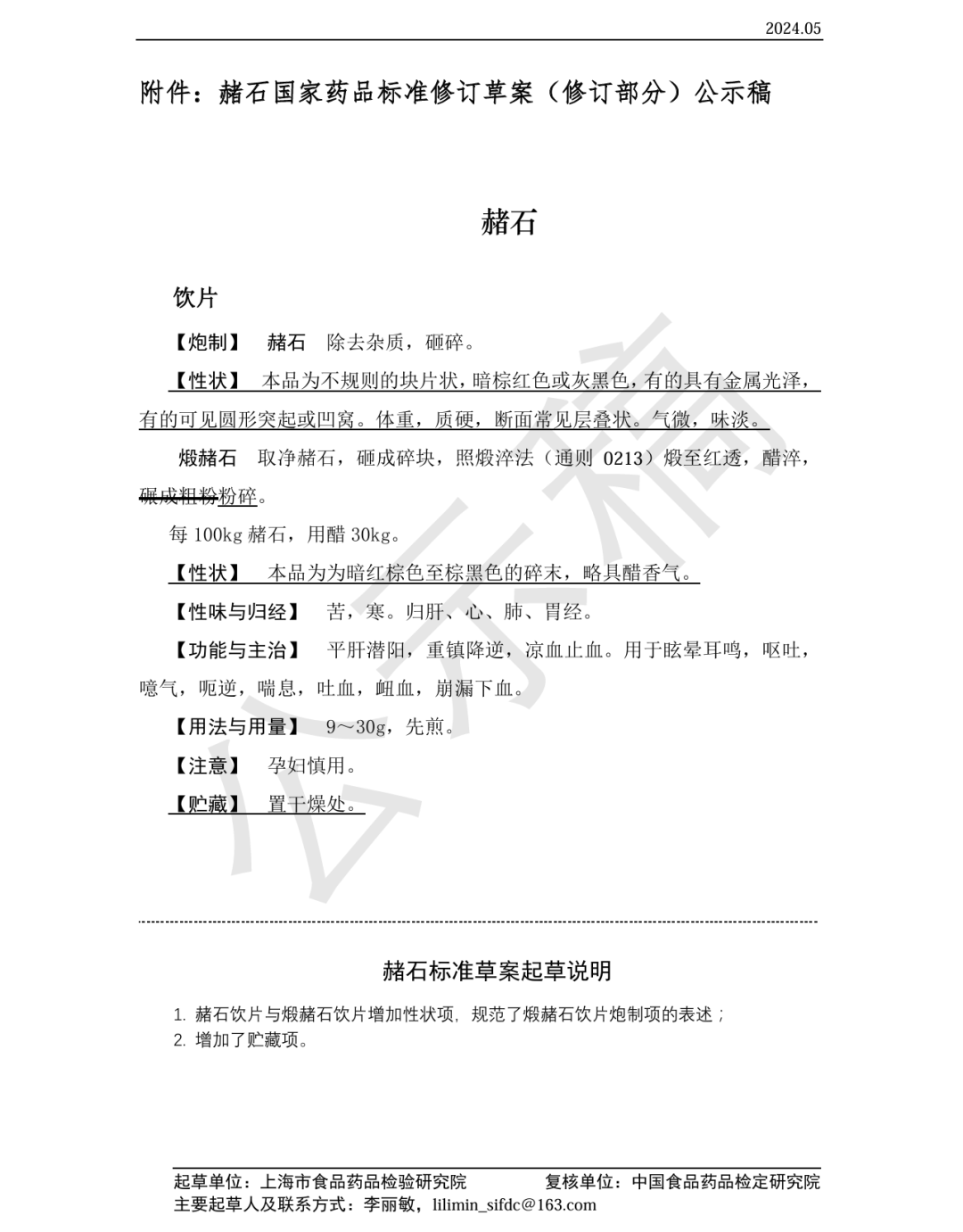 1.赭石饮片与煅赭石饮片增加性状项,规范了煅赭石饮片炮制项的表述;