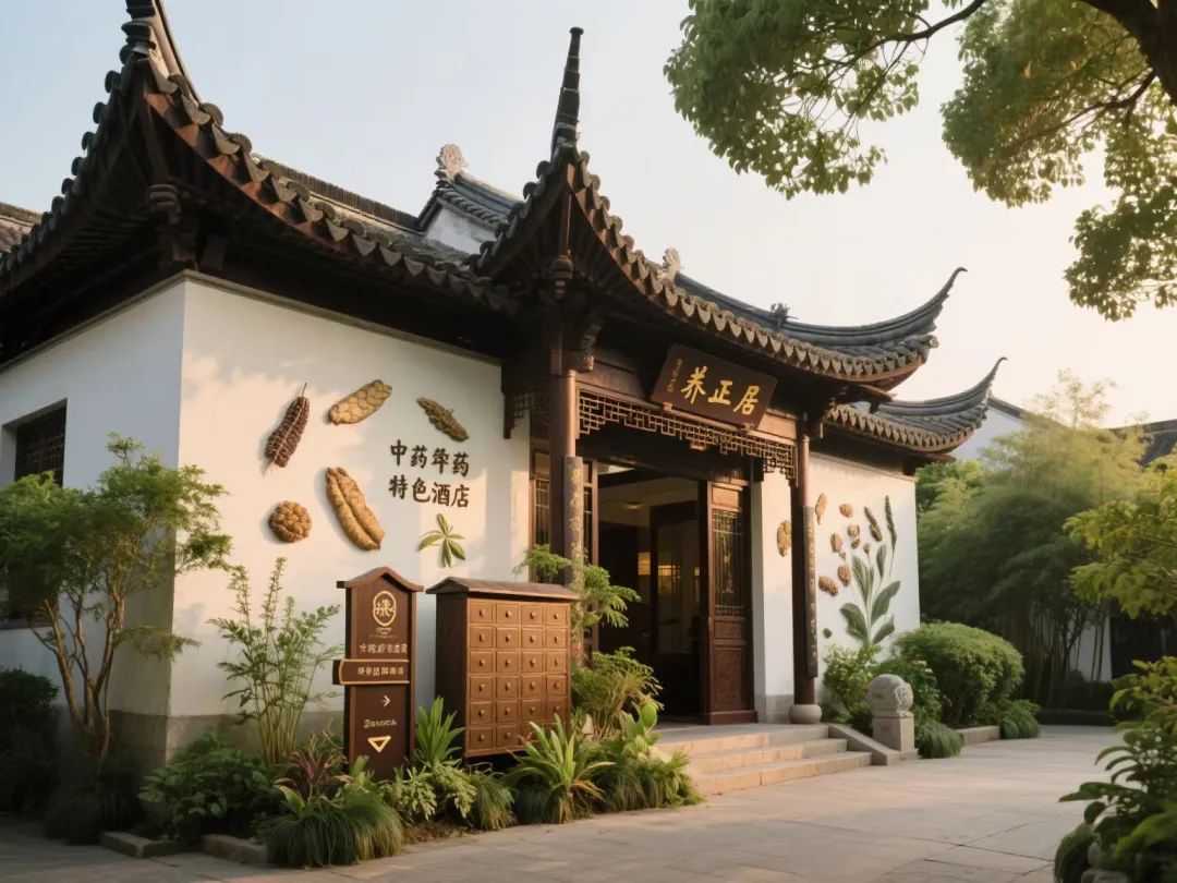 眼观:大厅中药标本馆、走廊本草图谱、房间内大宗药材主题装饰(如“当归房”配以当归纹样、香囊、特色茶饮)。
