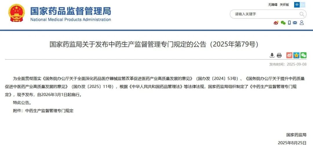 2025年9月8日,国家药监局正式发布《中药生产监督管理专门规定》(以下简称《规定》),将于2026年3月1日起施行。这一新规对中药饮片、中药配方颗粒、中成药、实施审批管理的中药材、实施备案管理的中药提取物等中药的生产监管提出了全新要求。