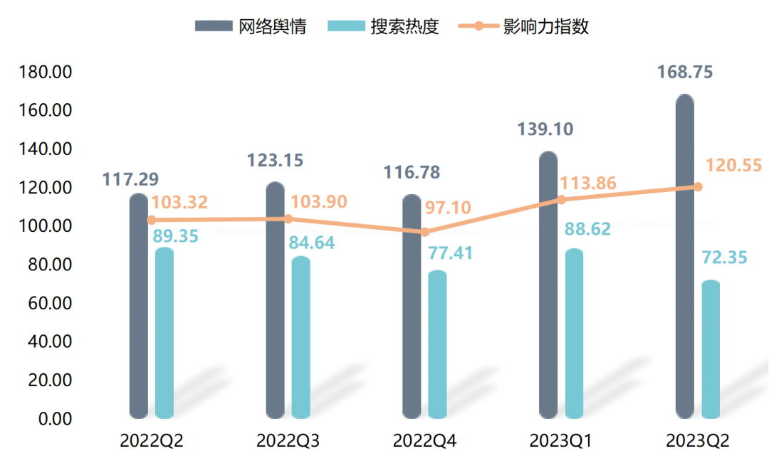 2023上半年,安国中药材影响力指数不断回升,一、二季度指数分别为113.86点和120.55点,环比分别上升16.76和6.69个百分点;细分指数中,网络舆情指数大幅提升,搜索热度指数先升后降。