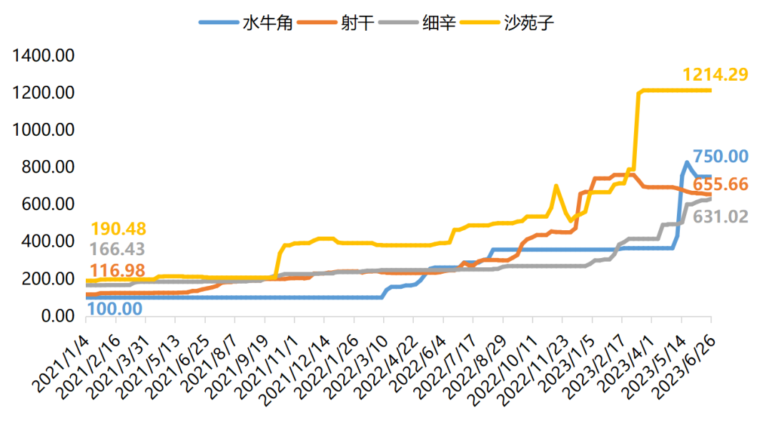 射干以前属于小品种,整体销量不大,但因射干具有清热解毒、祛痰利咽的功效,使得需求量越来越大,于2022年开始行情大幅上扬,并于2023年3月达到顶峰;目前行情略有下滑,但表现仍较为坚挺。截至2023年6月末,射干价格指数收于655.66点,较2021年初116.98点上涨460.49%。
