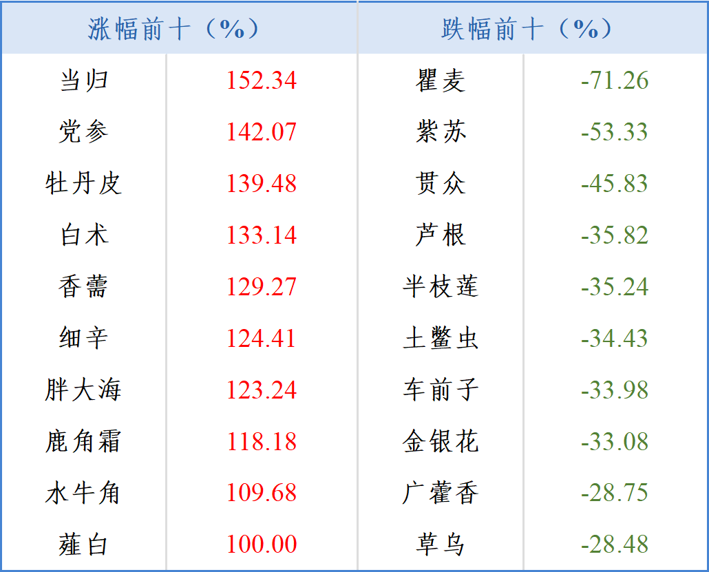 价格指数涨幅前十品种中,当归、党参、白术和薤白等药材近期产地行情持续上涨,关注度较高;牡丹皮和水牛角近期货源走销顺畅,持货商惜售,导致价格大幅上涨;香薷、细辛、胖大海以及鹿角霜等药材市场货源供应量偏少,或受产新量少,或受口岸来货量少等影响,市场人气较旺,价格不断上扬。