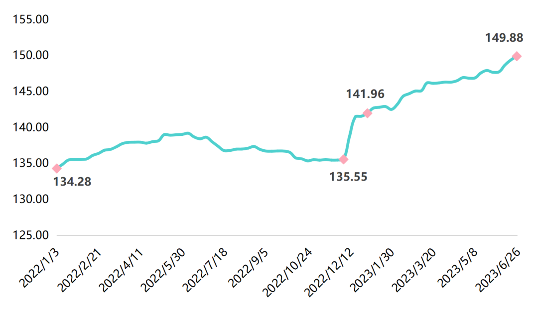 进入2023年,疫情影响逐渐消散,中药材市场行情按常规应呈现理性回落态势,但市场却一反常态,三、四月药市短暂降温后,五、六月产地市场淡季不淡,继续呈现火爆态势,带动市场内中药材价格持续走高。截至6月底(06.26-07.02),安国中药材价格指数收于149.88点,再次创下历史新高,较年初(01.02-01.08)141.96点上涨5.58%。