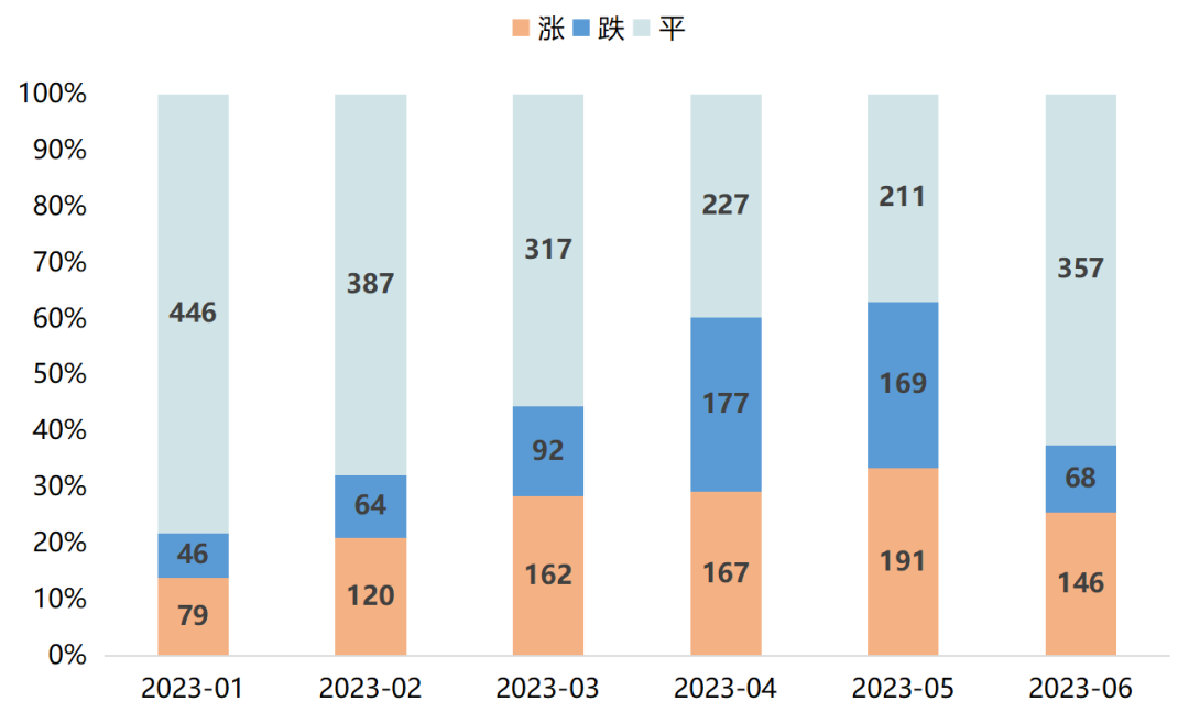 2023年上半年,安国中药材价格指数所监测的571个品种中,上涨品种数有265个,约占整体的46%;有135个品种下跌,占比约24%;169个品种价格指数无明显涨跌,占比约30%。