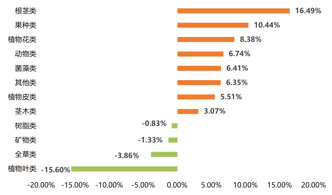 其中,根茎类和果种类中药材价格指数半年内涨幅均在10%以上,代表品中,当归、党参、牡丹皮以及胖大海等药材价格涨幅显著。植物花类、动物类、菌藻类、其他类、植物皮类和茎木类中药材价格指数分别上涨8.38%、6.74%、6.41%、6.35%、5.51%和3.07%,代表品中,水牛角和鹿角霜等药材价格也均实现翻倍上涨。植物叶类中药材价格指数在紫苏跌价的影响下,半年内下跌15.60%;全草类、矿物类和树脂类中药材价格指数跌幅可控,分别下跌3.86%、1.33%和0.83%。