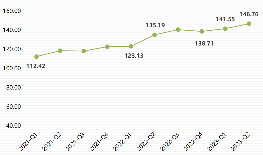 创新发展指数止跌回升。二季度,安国祁安药业、河北蔺氏盛泰药业等企业对于研发经费的投入较前期大幅增多,带动创新发展指数大幅回升,二季度指数收于148.16点,较2022年二季度138.39点(前期高位)上升9.77个百分点。