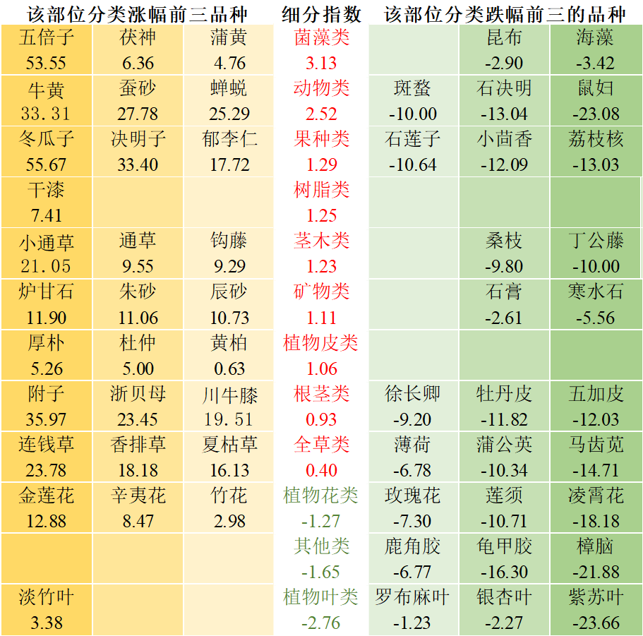 安国中药材按药用部位可以分为动物类、根茎类和果种类等12个子类,本期9个子类价格指数上涨,3个子类价格指数呈下跌走势。各子类价格指数及其涨跌代表品7月走势强弱程度如下表所示: