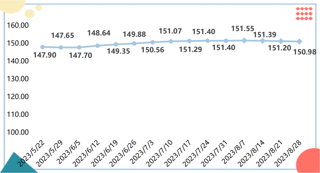 8月第二周(08.07-08.13),安国中药材指数收于历史高位151.55点,随后指数缓慢回落,截至最后一周(08.28-09.03),指数收于150.98点,较高位回落0.38%,较7月最后一周151.40点回落0.28%。