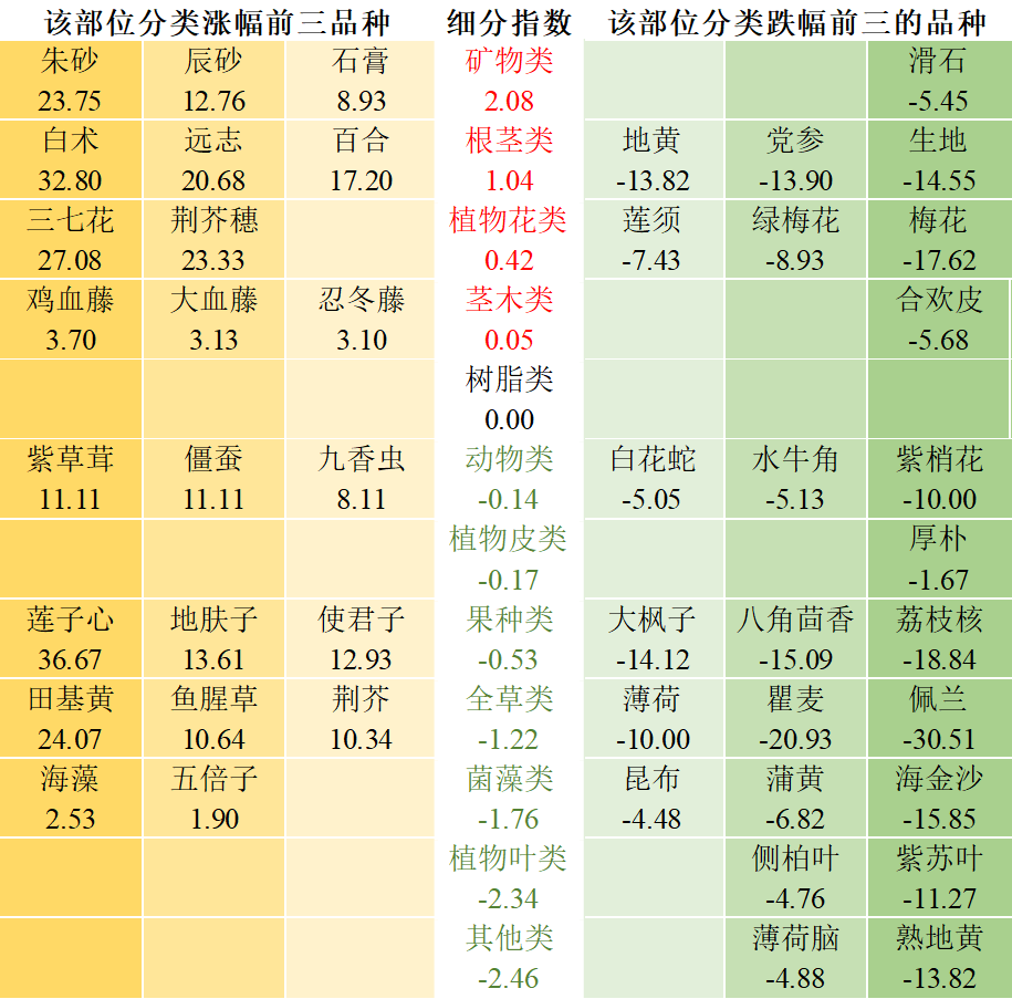 8月,矿物类中药材涨多跌少,月内价格指数整体上涨2.08%,涨幅前三品种分别为朱砂、辰砂和石膏;根茎类中药材价格指数月内上涨1.04%,白术、远志、百合等药材品种涨价明显;植物花类中药材价格指数月内上涨0.42%,三七花、荆芥穗等品种价格涨幅居前;茎木类中药材价格指数整体变动幅度较小;树脂类中药材价格指数保持稳定。动物类、植物皮类、果种类、全草类、菌藻类、植物叶类和其他类中药材价格指数则分别下跌0.14%、0.17%、0.53%、1.22%、1.76%、2.34%和2.46%。
