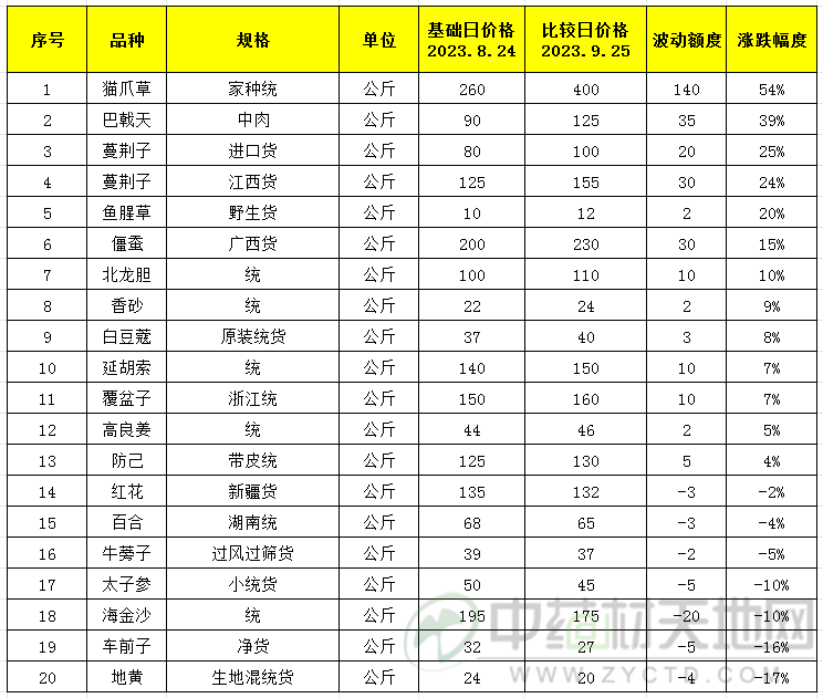 猫爪草、僵蚕、通草、远志、软紫草高位续高;海藻、昆布、海螵蛸受核废水排海后走动加快,价格上升;覆盆子、延胡索、浙贝母趋势向好,这离不开人气和资金的参与;蔓荆子关注度逐渐上升,并受今年产出量不大,行情稳步上涨,并尤以进口货涨幅较大;防己陈货库存剩余下降,新货上市量不大,价格出现上扬;北龙胆走动加快,行情进一步上涨;骨碎补大货供应紧张,价格坚挺;鱼腥草自今年产新以来一直有商关注并积极购进,行情逐步上升;巴戟天因为产地持续降雨天气的影响上货量少,导致价格出现明显上涨;三棱、莪术、葛根需求好于前阶段,行情略有好转;薏苡仁,随着价格走低,近日有商积极购进,带动行情微有回升;八角茴香、高良姜、豆蔻类、山柰、公丁香、香砂走快转升,应季产新参类品种逐渐好转。