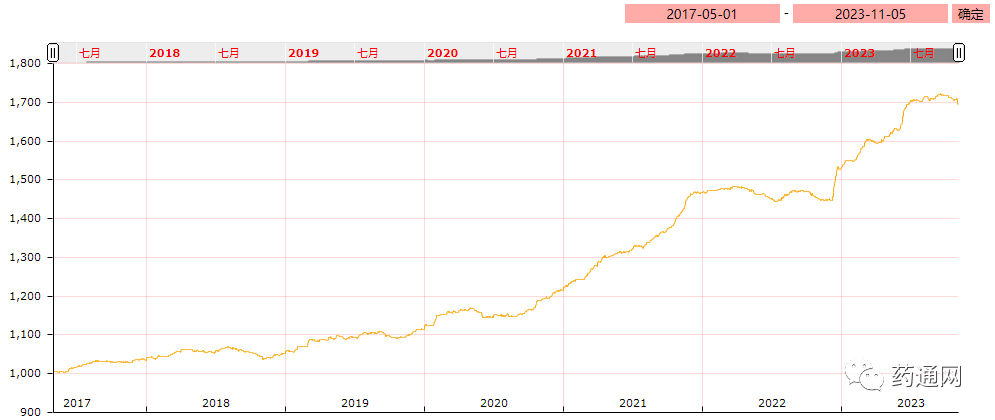 据对亳州中药材价格监测显示,2023年11月份第一期亳州中药材价格大盘指数为1704.39点(以2017年3-4月份平均价格为基期),与上期1705.9相比,下跌1.51点,跌幅0.09%。结合12类分类指数呈现“2涨5跌5持平”的态势。其中花类1337.37点,上涨0.84%;其他加工类1232.64点,上涨0.47%;根及根茎类1857.81点,下跌0.23%;果实种子类1687.53点,下跌0.08%;草类1547.8点,下跌0.33%;菌藻类1495.52点,下跌0.05%;动物类2047.7点,下跌0.02%。