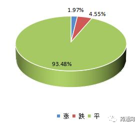 本期大盘品种涨跌环比分析显示,涨价品规占比1.97%;跌价品规占比4.55%;平价品规占比93.48%。目前药市整体行情仍处于小幅震荡下调阶段,实际用药终端采购力度较弱,货源走销迟缓。