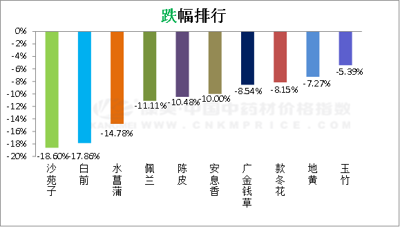 11月16日指数达到本期最高值2115.2点;最低值为11月21日的2106.3点。波动最大的是11月21日的0.15%,波动偏大。又到一年产新季和国际贸易时,国内国际大宗农产品价格继续承压,托市收购不如同期,正常缓慢流动中。市场方面:产地因雨产慢,鲜郁金转升带动干货;冬瓜子、苍耳子继续上涨;白蔻、黑胡椒成本提高,香料企稳;龙胆草、细辛、丹参坚挺按需走动;瓜蒌、水蛭、土鳖虫新货价格不振,陈货稍坚挺;蔓荆子进口增多待消化;款冬花、甘草、玉竹、金樱子转小幅下跌;半夏,防风、玄参、紫菀、薤白、白前、百部、茯苓、白芷、白前、川芎、蛇舌草、野菊花、菟丝子、菊花等还在下滑,行情难以乐观;益智仁跌后稳,后续空间不大;覆盆子、浙贝母缓落,持货心理转化当中;枳实及陈皮、柑橘类近期产新供应增加;山银花、连翘、草果滑后走快;郁李仁转稳;沙苑子量产暴跌,山茱萸震荡中,各市场不一。产地方面:宁夏沙苑子急转直下,关注较多;湖北独活平稳,九香虫关注较高;甘肃根茎类,党参热度较前两天回落,与当归、黄芪等相似,成交量一般,高规格较好,大黄、大青叶急于出货,板蓝根产毕价低惜售中,半夏减产但外地货冲击迫降;山西柴胡、黄芩缓跌中;广东柠檬、四川、贵州淫羊藿、急性子、鱼腥草、河南青葙子供应有量,少商关注;各地黄精货增;贵州薏苡仁有陈货加工冲击行情;河南山茱萸止落反弹;辽宁平贝、五味子走慢,宁夏菟丝子、广西受进口僵蚕增多,行情转滑,骨碎补行情转慢。2、根茎跌幅后移