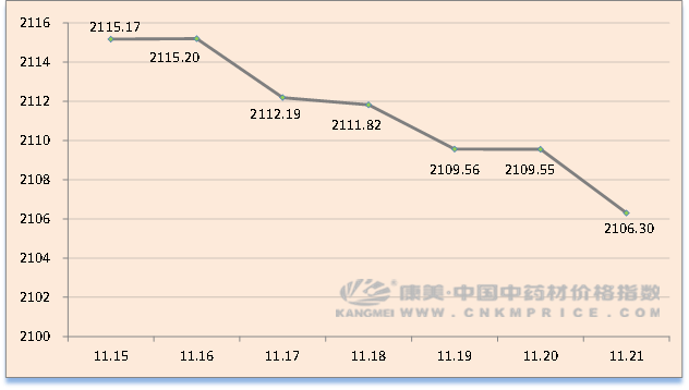 2023年11月21日(星期二)康美·中国中药材价格指数值为2106.3点,比上周同期下跌8.9点,跌幅为0.42%,跌幅偏高,跌幅环比续缓0.2个百分点。