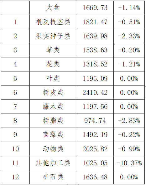 据对亳州中药材价格监测显示,2023年11月份第三期亳州中药材价格大盘指数为1669.73点(以2017年3-4月份平均价格为基期),与上期1689.02相比,下跌19.29点,跌幅1.14%。结合12类分类指数呈现“8跌4持平”的态势。其中根及根茎类1821.47点,下跌0.51%;果实种子类1639.98点,下跌2.33%;草类1538.63点,下跌0.2%;花类1318.52点,下跌1.21%;树脂类974.74点,下跌2.83%;菌藻类1492.19点,下跌0.22%;动物类2025.82点,下跌0.99%;其他加工类1025.05点,下跌10.37%。