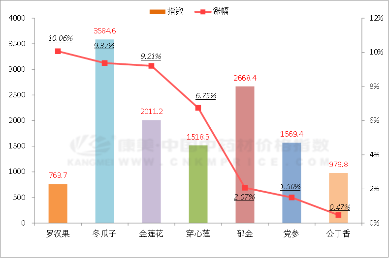 本期价格上涨稍大的品种有罗汉果、冬瓜子、金莲花、穿心莲、郁金、党参、公丁香、巴戟天等。