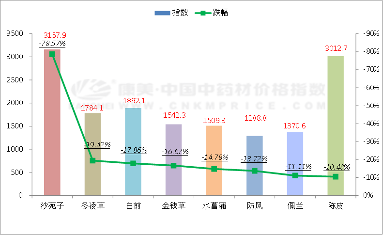本期价格下跌稍大的品种有沙苑子、冬凌草、白前、金钱草、水菖蒲、防风、佩兰、陈皮等。