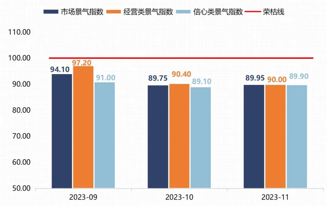 安国药商经营类景气指数为90.00点,再度下滑0.40个百分点,各细分经营类指标景气指数也均收于90.00点,在本应是旺季的11月,中药材市场销售状况表现较为平淡。安国药商信心类景气指数为89.80点,环比微升0.70个百分点,各细分信心类指标景气指数虽较10月略有提升,但仍处于较低水平。