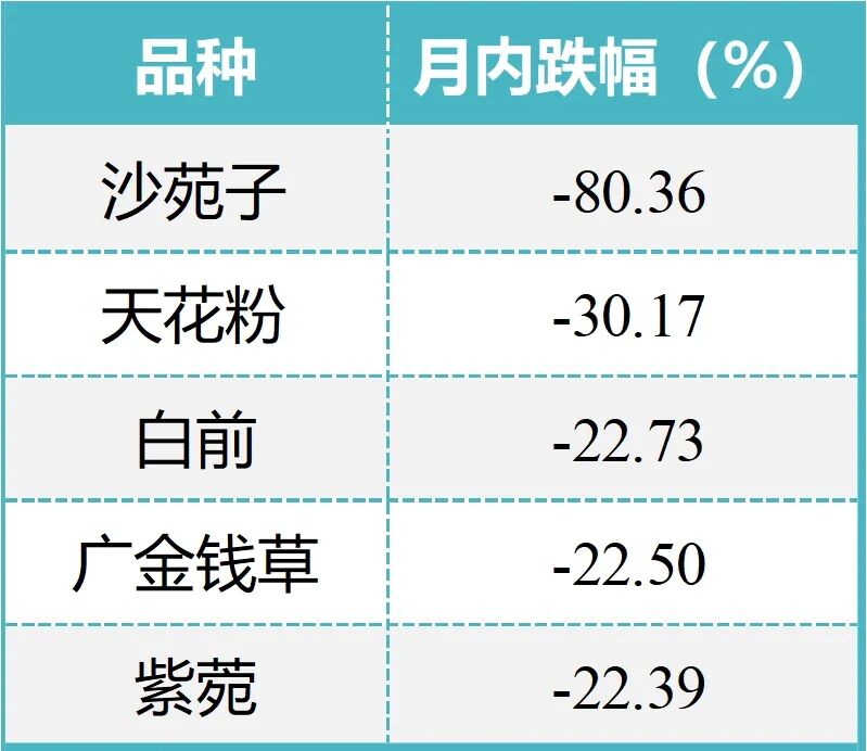11月,安国中药材价格指数所监测的571个品种中,价格上涨品种73个,约占整体的13%,较10月减少3个;下跌品种174个,占比约30%,较10月大幅增加56个;其余324个品种无明显涨跌。