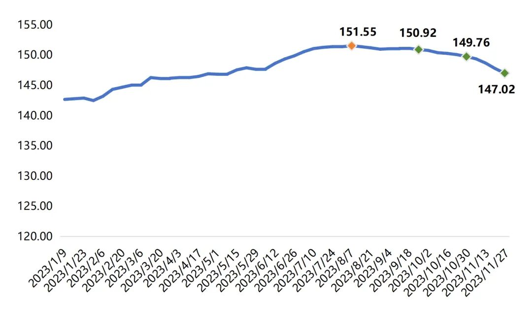 纵观2023年安国中药材价格指数的整体走势,指数于2023年8月第二周(08.07-08.13)达到历史峰值151.55点后开始回落,9月最后一周(09.25-10.01)以来指数呈连续回落态势。截至11月最后一周(11.27-12.03),安国中药材价格指数收于147.02点,较当月第一周(10.30-11.05)149.76点回落1.83%,较前期历史高位回落2.99%。