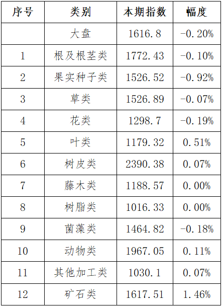 据对亳州中药材价格监测显示,2024年1月份第二期亳州中药材价格大盘指数为1616.8点(以2017年3-4月份平均价格为基期),与上期1620.08相比,下跌3.28点,跌幅0.2%。结合12类分类指数呈现“5涨5跌2持平”的态势。其中叶类1179.32点,上涨0.51%;树皮类2390.38点,上涨0.07%;动物类1967.05点,上涨0.11%;其他加工类1030.1点,上涨0.07%;矿石类1617.51点,上涨1.46%;根及根茎类1772.43点,下跌0.1%;果实种子类1526.52点,下跌0.92%;草类1526.89点,下跌0.07%;花类1298.7点,下跌0.19%;菌藻类1464.82点,下跌0.18%。
