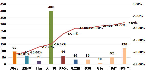 沙苑子:产新基本结束,近日行情也暂止落转稳,新货售价52-55元之间;包含量陈货90-100元。丝瓜络:受新货陆续上市冲击行情逐步跌落,浙江选个价格在50-55元,统货35-40元,丝因质量不等价格悬殊较大,选丝60元上下,统货40-50元;江苏货价位相对偏低,选个45元。白芷:近期货源持续走缓,持货商家多急于出手,行情逐步跌落,现无硫小统货售价18-19元;统货20元左右,选装22-23元。天竺黄:近期行情一直小幅震荡,导致市场经营商家多不敢贸然购货,商家们多采取勤进快销的方式维持经营,价格进一步显疲,现人工货30元,进口天然货要价400元,国产天然货200元。玫瑰花:近期货源走动迟缓,今年产新期间价位偏高,商家亏损严重,现甘肃货售价60-64元;山东货55-58元。红豆蔻:关注商家较少,目前市场可供货源量较丰,持货商售货态度积极,不过货源走销情况并不理想,行情暂保持低迷状态,现亳州市场统货35-36元。孜然:受印度市场价格下调影响,市场货源走动转缓,行情逐步下滑中,玉林市场统货售价35元左右;亳州市场要价36-37元。陈皮:受新货不断上市冲击,行情逐步回落,现炕个售价7.8-8.5元;炕丝因质量不等价格在9.5-10元,商家多以积极售货态度为主,货源走动不快。山桃仁:近期市场来货量较前期增加,价格微落,目前市场多数商家仍持观望态度,货源多以零星交易为主,现统货50-52元。郁李仁:近期市场货源走销不及前期畅快,价格稳中有落,经营商们多采取勤进快销的方式来维持经营,现内蒙包检验货要价115-120元。