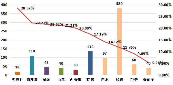 火麻仁:近期需求量上升,货源走动畅快,持货商手中存量不丰惜售心理较强,行情逐步上涨,现带壳货售价18元左右;去壳仁价格在36元上下。肉苁蓉:市场货源走动较前期略有好转,硬大芸统货售价47-48元(九成干左右),干品价格在52元;软大芸干度也逐步提高,统货售价90元,中条货售价110-115元。仙茅:随着口岸封关导致市场来货中断,目前经营商手中存量薄弱,行情逐步上涨,进口个子价格在45元,片48元;国产货含量高,价格相对偏高,个子在135元。山柰:正值产新,近几日传出减产消息,受此影响,关注商家增多,货源走销进一步加快,价格出现小幅上调,现玉林香料市场进口小圆片原货价格在34.5-35.8元,进口水洗小圆片33-33.5元,国产足干阳春货价格在39.5-41.5元。西青果:经过前期的不断消化,产地及市场库存货源量均已显薄,近期市场寻货商家一直不减,价格持续保持坚挺,现统货30-32元。党参:在产地价升的带动下市场行情也随之上调,商家惜售心理增强,现小条要价125元左右;中条130-135元;过3号筛厚片价格在145-152元之间。白术:走动加快,行情持续上涨,地产一年生统货售价80-85元;两年生统货97元,选装货110元左右;河北生切片90-95元。珍珠:前期上下波动的行情现已逐渐趋于稳定,不过目前商家仍多是持观望态度,货源成交量不大,价格暂止升转稳,现统货要价380元,优质货400元。芦荟:近期市场货源得到了良好的消化,经营商对后期期望值增高,惜售心理不断增强,行情小幅升温,现进口货60元,国产货25元。青葙子:近日市场寻求优质货的商家增多,带动货源小批量走畅,目前优质货可供量较少,导致价格稳步上扬,现色选货42元。