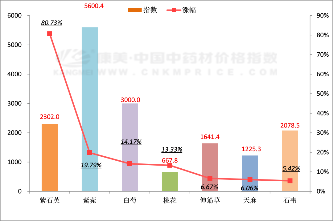 本期价格上涨稍大的品种有紫石英、紫菀、白芍、桃花、伸筋草、天麻、石韦、银柴胡等。