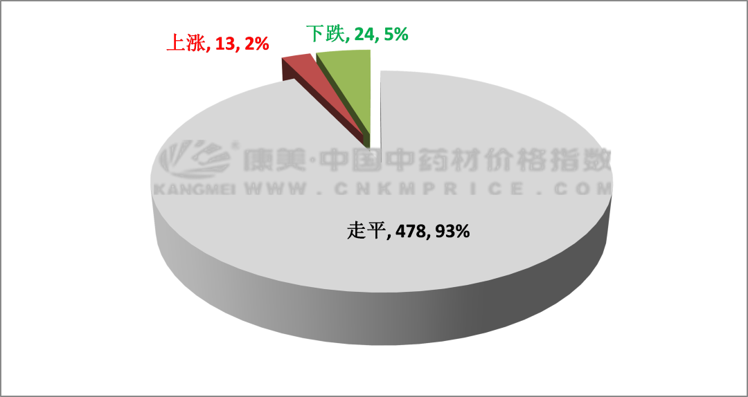 在价格变动的产品中,价格上涨稍大的品种包含紫石英、紫菀、白芍、桃花、伸筋草、天麻、石韦、银柴胡等;下跌幅度较大的品种有牛膝、沉香、重楼、射干、莲须、海螵蛸、玄参、红景天等。