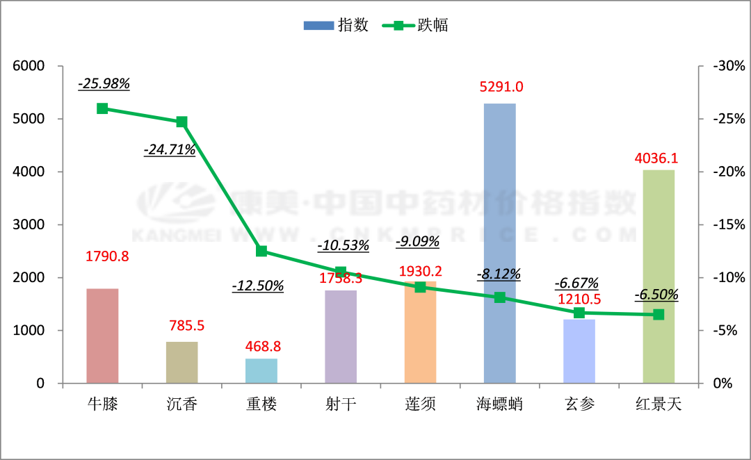本期价格下跌稍大的品种有牛膝、沉香、重楼、射干、莲须、海螵蛸、玄参、红景天等。