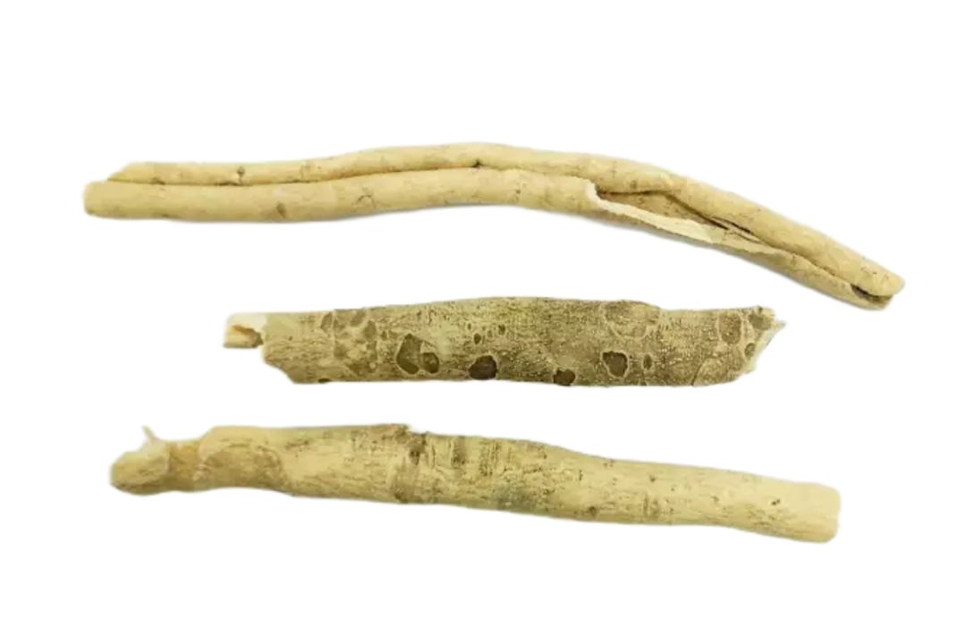 【性状】本品呈卷筒状,长5~15cm,直径1~2cm,厚0.2~0.5cm。外表面灰白色或淡灰黄色,具细纵皱纹和细根痕,常有突起的颗粒状小点;内表面类白色,有细纵纹。质脆,折断时有粉尘飞扬,断面不平坦,略呈层片状,剥去外层,迎光可见闪烁的小亮点。有羊膻气,味微苦。