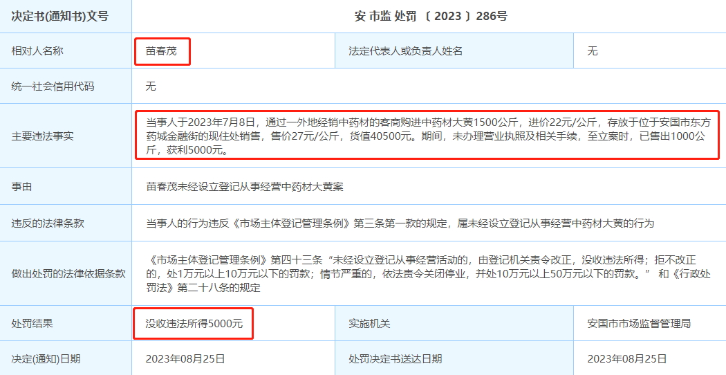 事由:苗春茂未经设立登记从事经营中药材大黄案
